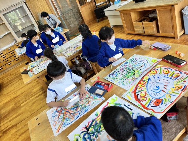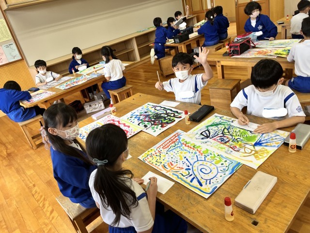1年生の図画工作科では絵の具を使って活動しています。子供たちは、絵の具や筆の使い方に少しずつ慣れ、のびのびと筆を走らせて様々な模様を描きました。ぐるぐる、くねくね、まっすぐ、てんてんを駆使してカラフルな作品に仕上げました。今日は自分の描いた絵に名札を付けました。どんなものに見えるか考えたり、思いつたお話を取り入れたりして題名を考えました。やっと完成した作品に満足気な子供たちでした。