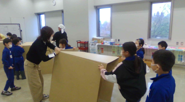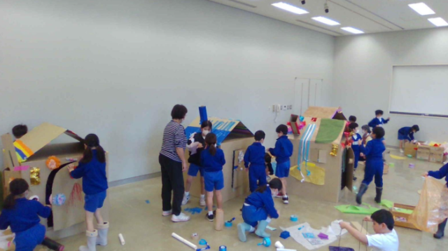 世界各国からやってきた絵本を見たり、大きなダンボールの家を作ったりしました。ダンボールの家づくりでは、初めて使うダンボールカッターでドアや窓を作りました。そのあと、たくさんの飾りをつけて、きれいで楽しい家に仕上がりました。
