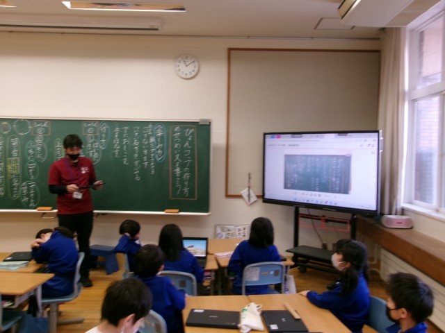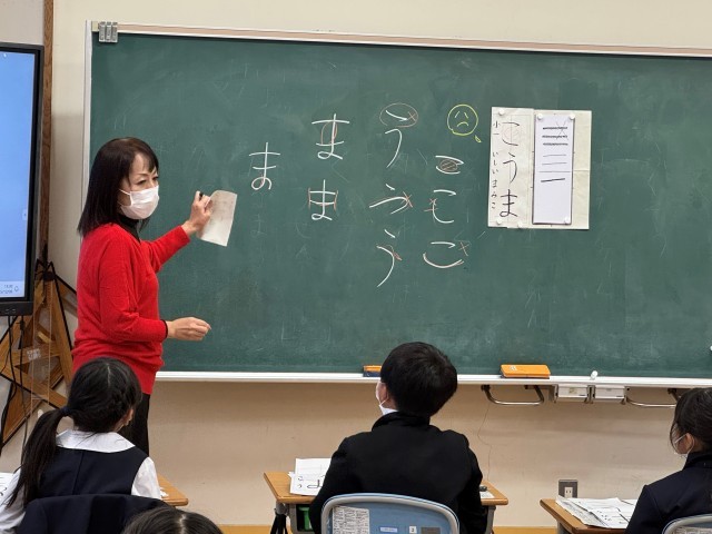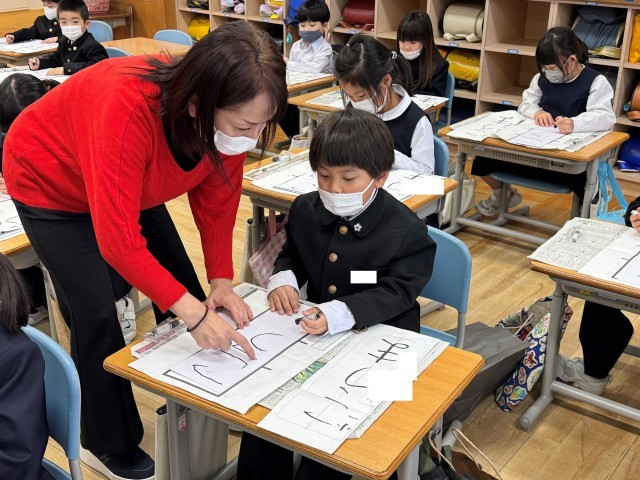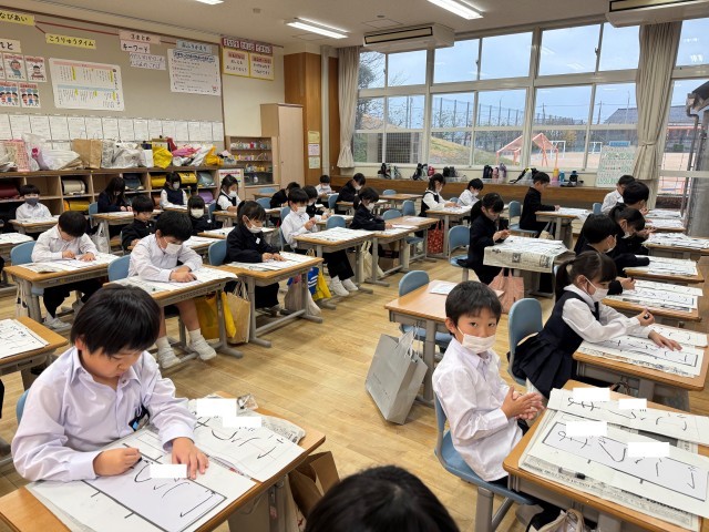 1年生は、初めての書初で「こうま」と書きます。今日は、書初指導の飯田先生に来ていただき、上手に書くポイントを教えていただきました。まず、飯田先生から、黒パスの角で書くこと、中心を意識して書くこと、文字のバランスを整えること等、たくさんのポイントをお聞きしました。次に、そのポイントを意識しながら、紙に丁寧に字を書きました。「いつもより濃く書けたよ」「はねるところが上手く書けたよ」と、自分の字を見て上達したことを喜ぶ姿が見られました。1月の書初大会まで、たくさん練習してもっと上手になることを期待しています。