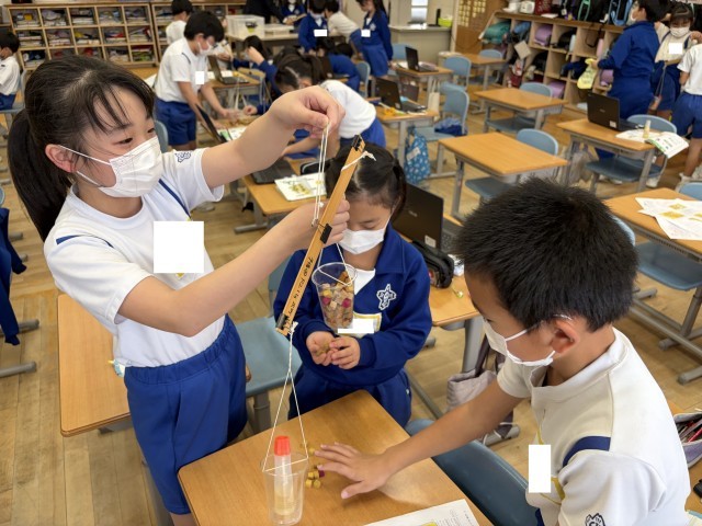 3年生では、「重さをはかって表そう」の学習をしています。今日はコンパスやはさみ、のり等を使って重さくらべをしました。