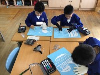 5年生では音楽の授業で自分たちで楽器やパートを決め、合奏を行っています。「どんどん使う楽器の数を増やして、盛り上がるようにしたい!」「鍵盤ハーモニカだけのパートをつくって、メロディーが目立つようにしたい!」など、グループで楽器やリズムの重ね方を工夫していました。休み時間も仲間とアドバイスしながら何度も練習を行い、発表会では各グループが練習の成果を発揮し、音が重なり合うひびきを味わいながら演奏を楽しむことができました。