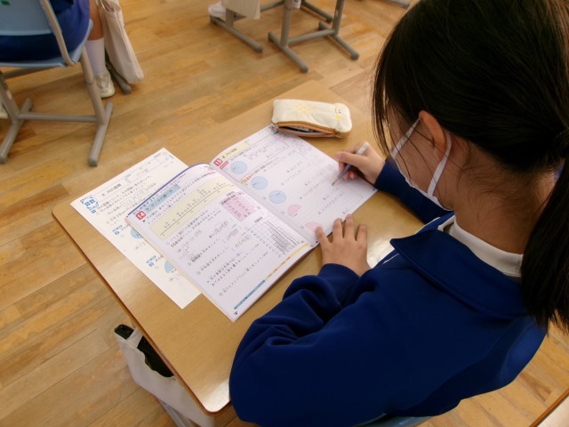 学び合いを通して考えを深める時間だけでなく、漢字・計算ドリルや調べ学習を通して基礎基本を確かにする時間も大切にしています。どの教室でも、真剣に課題に取り組む姿が見られます。