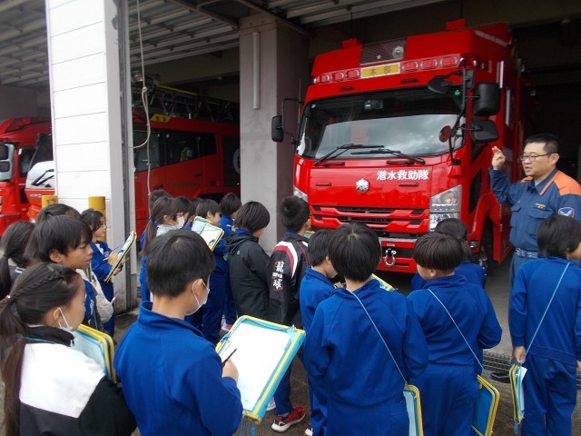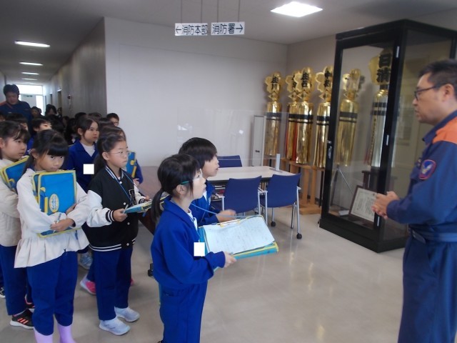 3年生は校外学習に出かけました。行き先は砺波消防署。消防や防災、救助・救命のためにどのような取り組みをしておられるのかを調査しに行きました。消防署の施設のひみつや消防ポンプ車のひみつ、すぐに出動できるためのひみつなど実際に働く場所を見学させていただきました。また、そこで働く消防士の方は「困った人を助けたい」という思いをもって働いておられることを知り、子供たちは「強い思いをもって働いておられてすごい。」や「かっこいいな。」と感じたことを伝え合いました。