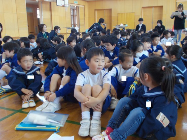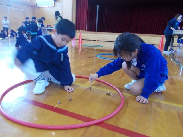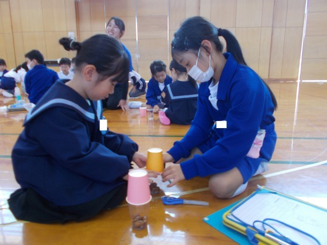 1年生と年長さんとの交流会で、生活科「あきのおもちゃをつくろう」の学習をしました。まず、1年生と年長さんがペアになり、自己紹介をしました。次に、「こま」「まつぼっくり」「やじろべえ」「けんだま」の中から選んだおもちゃをペアで作りました。1年生が作り方を優しく教えたり、一緒に楽しく遊んだりする姿が見られました。最後に、楽しかったことを振り返りました。「またおもちゃの続きを作りたい」「もっと一緒に遊びたい」などの声が聞こえてきました。1年生は来年の春が待ち遠しくなったようです。