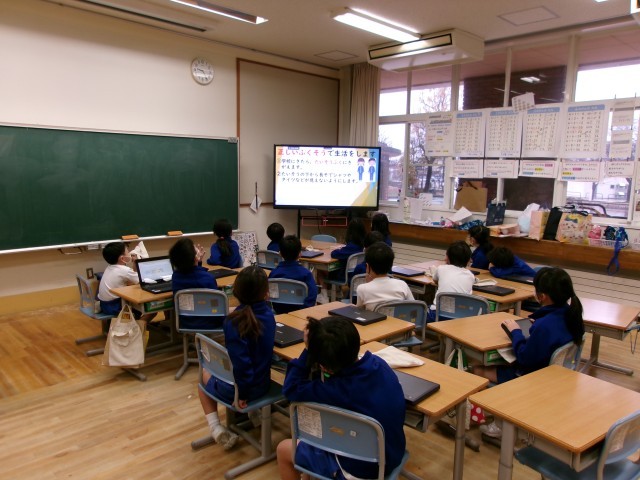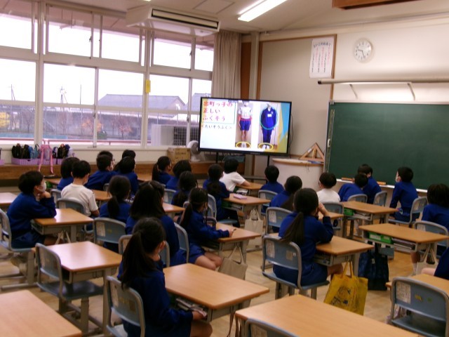 12月に入り、日増しに寒さを感じる季節となりました。2学期も残りわずかですが、出町っ子みんなが気持ちよく生活するために、今一度あいさつの意味や正しい服装について考えました。各クラスに流れる画像を見ながら、出町っ子のあいさつ「あったか♡(ハート)」(あ(明るい声で)っ(つなごう)た(たくさんの人と)か(関わろう)♡(あったかハート))を確認しました。また、制服や運動服の身だしなみや靴の履き方等についてもおさらしました。最後まで、みんなが気持ちよく生活できるよう心がけていきます。