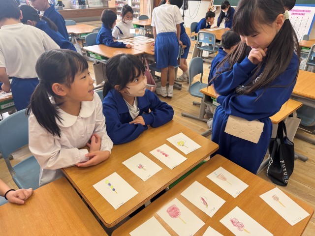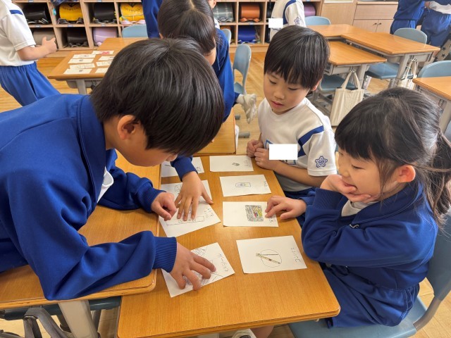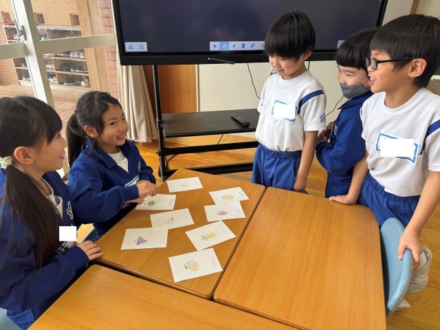 国語科「ものの名まえ」の学習で、おみせやさんごっこをしました。おにぎり屋さんや文房具さん、ゲーム屋さん等、自分のやりたいお店を考え、売りたいものをカードに描きました。おみせやさん役とお客さん役に分かれて、「いらっしゃいませ」「○○をください」「○○円です」など、丁寧な言葉でやりとりすることができました。これから、本当にお店へ行ったときにぜひやりとりにチャレンジしてみましょう。