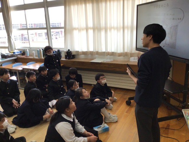 1年間一緒に過ごしてきた友達や先生と最後の時間を過ごしました。それぞれの学級では、1年間の軌跡を写真や動画を使って振り返ったり、先生からメッセージを聞いたりして、進級への気持ちを高めました。