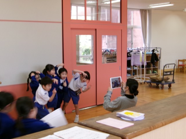 係のみんなで相談してポーズを決め、掲示用に先生に写真を撮ってもらいます。