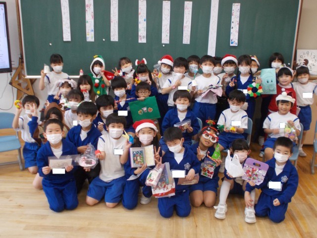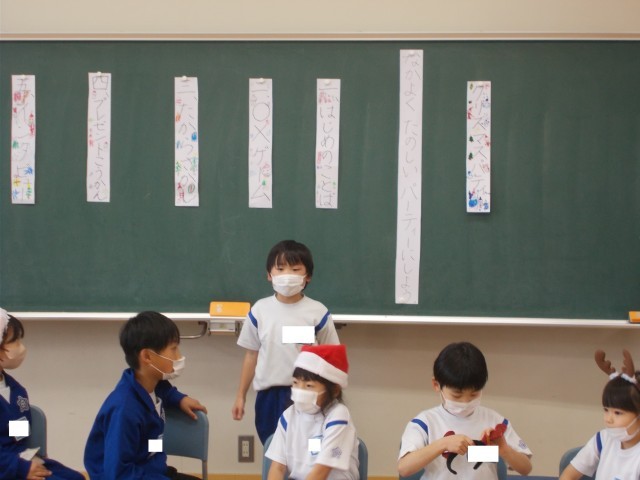 いよいよ今週はクリスマス!少し早いですが、クリスマスパーティーを行いました。子供たちがクリスマスらしい出し物をしたいと考え、クリスマスに関する○×ゲームや宝探し、プレゼント交換をしました。「宝探しで見付けたカタカナカードをつなげると『ツリー』になるよ」「〇〇さんが折り紙でつくったリースがかわいいね」など、どの出し物もとても盛り上がりました。よい子のみなさん、サンタさんがやって来るといいですね♪