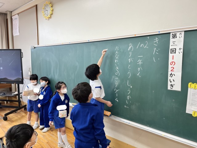 1年2組では、子供たちが進行を務め、学級会を進めています。司会グループの子供たちは、司会、黒板書記、ノート書記に分かれて役割を果たしました。今日の議題は「一年間ありがとう集会でしたいこと」です。自分で考えた意見をグループの人と相談して一つに絞り込み、発表しました。最後には学級全体で話し合い、「短なわ生き残りゲーム」「ハンカチ落とし」「爆弾ゲーム」の3つに決まりました。今日から既に楽しみな様子の子供たち。これから協力して準備を進めていきます。