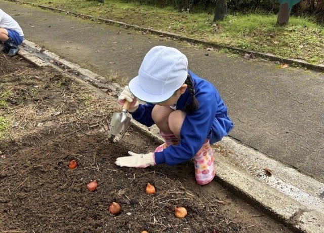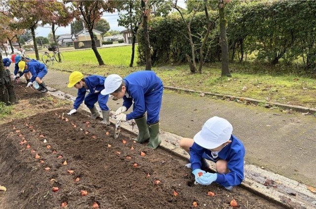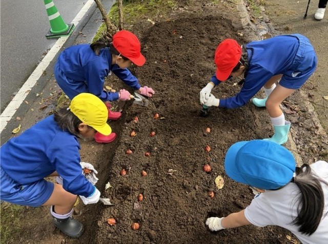 チューリップ四季彩館の方の指導の下、球根植栽体験を行いました。
