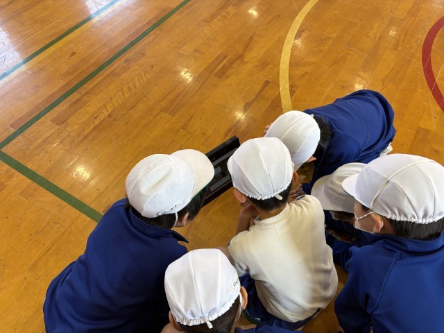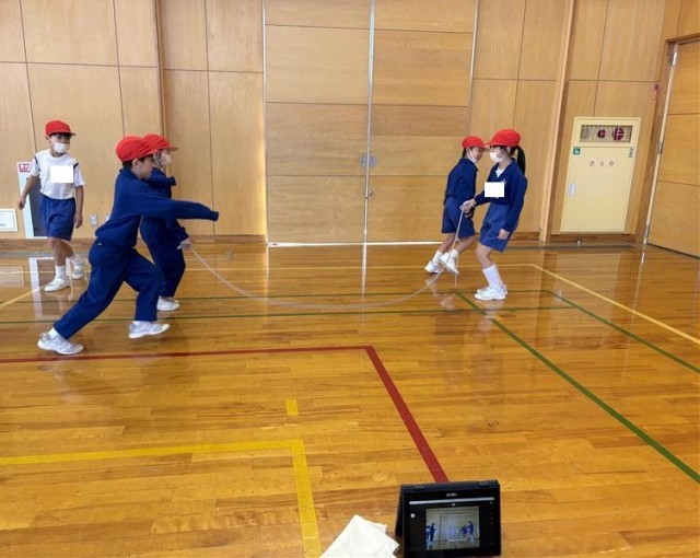 縄に入るタイミングや跳ぶ位置について、友達同士でアドバイスを送り合いながら練習に励んでいます。また、自分たちの跳ぶ様子をタブレットで撮影し、動画を見て改善点を見付けるなど、より多くの回数を跳べるよう、みんなで工夫と努力を重ねています。