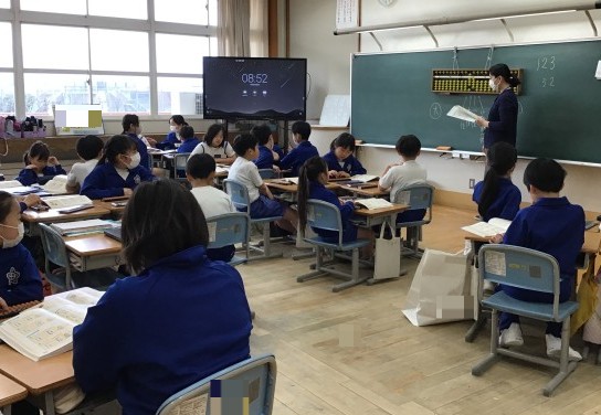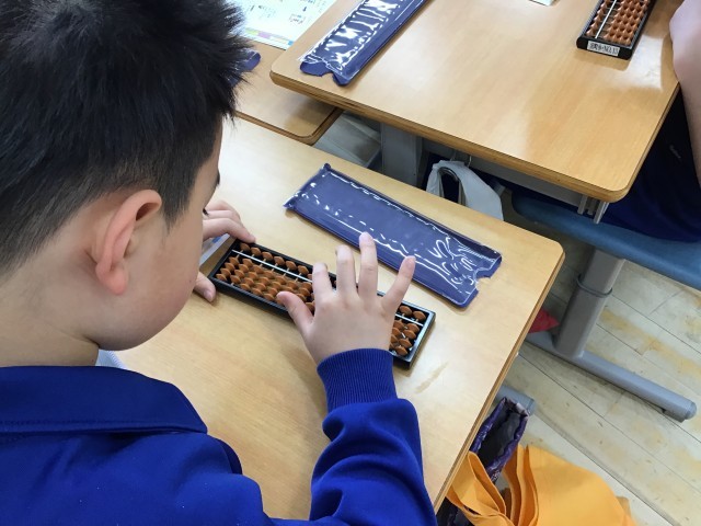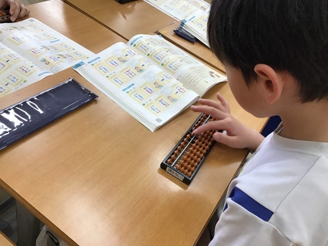 3年生は本日、算数科の学習でそろばんを使って計算する方法を学習しました。子供たちは、先生が大きなそろばんを動かす様子を真剣に見てから、教科書と自分のそろばんを見比べて慎重にそろばんを動かしていました。