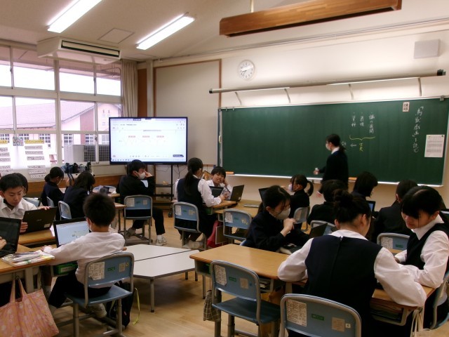 本日、6年生は出町中学校に見学に行きました。最初に、中学校の校長先生から校訓である「天資養活 自他共栄」習い、4か月後には自分たちも中学生になるという実感をもちました。理科・体育・数学等、様々な教科の授業を見学したり、質問コーナーでは不安に思っていることや疑問に感じていることをたくさん質問したりしました。最初は、不安でいっぱいの子供たちでしたが、見学が終わり小学校に帰ってくると、「中学校楽しみ」という声があちらこちらで聞こえてきました。卒業まで残り4か月。子供たちと1日1日を大切にして過ごしていきたいと思います。