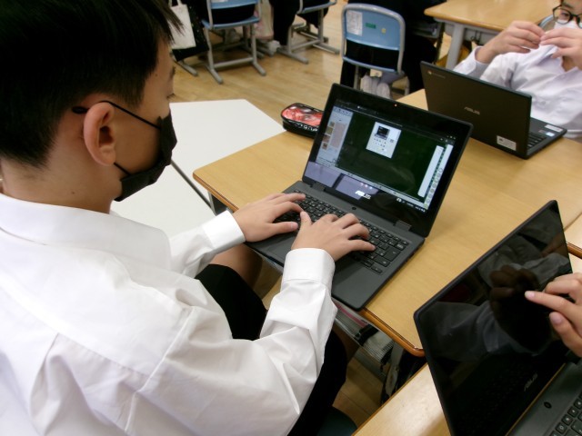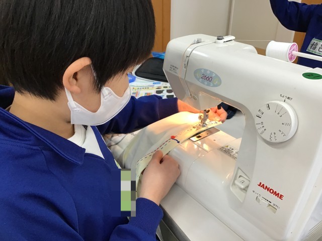 子供たちは、家庭科の授業でエプロンを製作しています。エプロンに付けるポケットの位置や大きさ、ワッペンの形を工夫することで、オリジナルのエプロンが出来上がってきました。一人一人のこだわりが詰まったエプロンの完成を楽しみにしていてください。