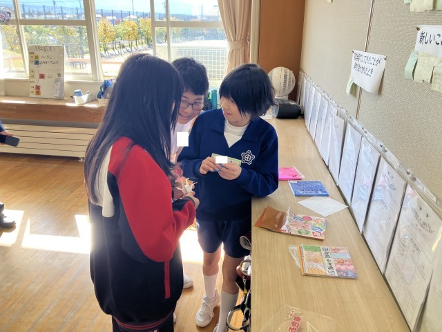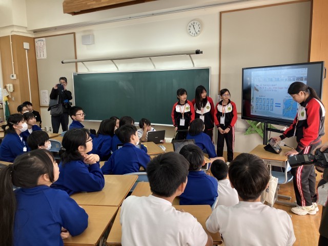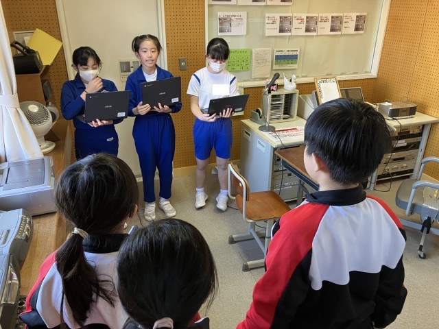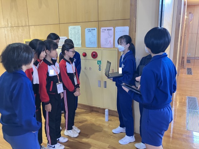 グループに分かれて、学校を探検しながら各教室を紹介しました。これまで外国語科で培った力を生かして、英語で伝えました。理解してもらえたかな…。