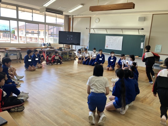 教室に戻り、「お楽しみ会」をしました。みんなで輪になってゲームをしたり、一緒に折り紙を折ったりして、交流を深めました。