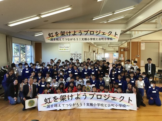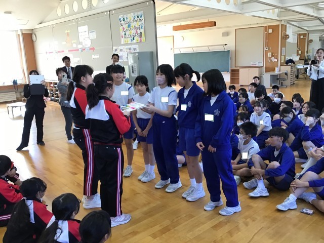 ランチルームで一緒に給食を食べたあと、とうとうお別れのセレモニー。互いにプレゼントの交換をし、それぞれの感想を伝え合いました。