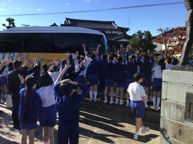 別れを惜しむ子供たち。バスが見えなくなるまで、手を振って見送りました。