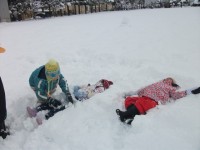 待ちに待った雪遊び!グラウンドに降り積もった雪を見てわくわくしていた1年生!雪に寝転んだり、かまくらをつくったり、そり滑りをしたりと雪と仲よしになりました。