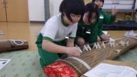 講師の先生にお越しいただき、琴を演奏しました。親指で力強く弦を押すようにすると、きれいな音色が出ました。「さくら」を最後まで演奏できる子もいました。