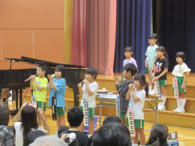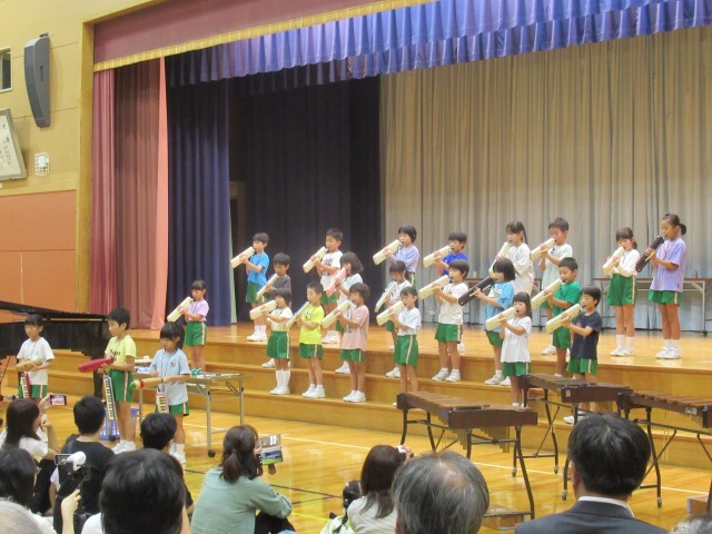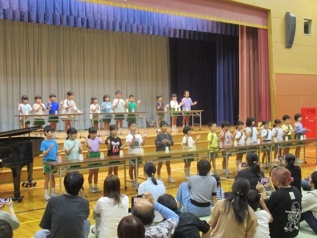 2年生は「かえるの合唱」や「かっこう」をギロや鳥笛等の楽器を使って演奏しました。さらに、紙コップを使って全員でリズムに合わせて音を出しました。