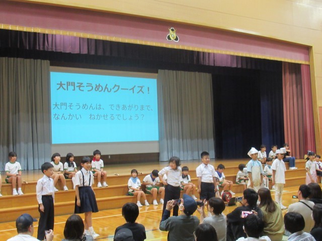 3年生は、総合で調べている「大門そうめん」について、歴史や作業工程などをクイズや劇で観客の皆さんに発表しました。