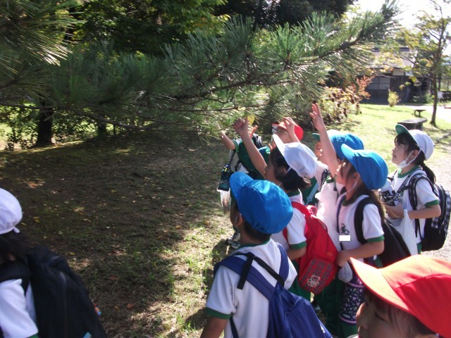 チューリップ公園では、「ここにどんぐりがいっぱいある!」「見て!大きな葉っぱ!」「しーっ、帽子にトンボがとまっている!」などと、いろいろな秋を見付けました。