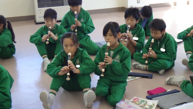 音楽に合わせてグループづくりをした後、歌ったりリコーダーを演奏したりしました。
