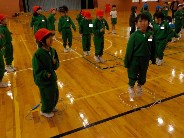 まずは、なわを輪にして、両足同時につま先で着地したり、同じ場所に着地したりする練習をしました。