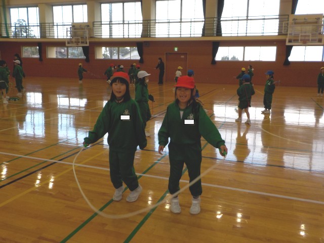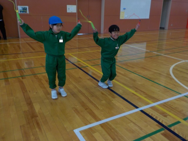 その後は、1年生と2年生でペアになって、跳んだ回数を数え合ったり、二人でなわを跳んだりしました。