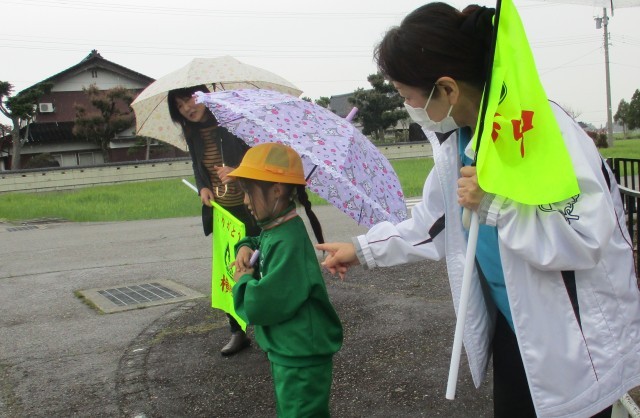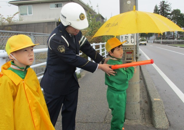 砺波警察署と庄南応援隊の方をお迎えして、新入生の交通安全教室を行いました。雨が降り始めて、視界が遮られる状況で具体的に安全確認の仕方を学びました。学習したことを生かして、これからも自分のいのちを自分で守りましょう。