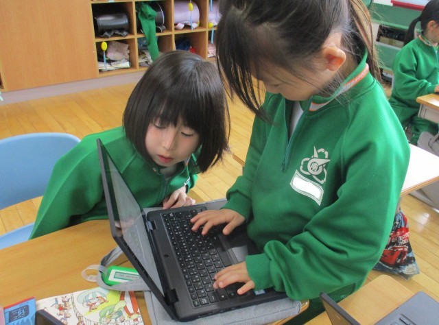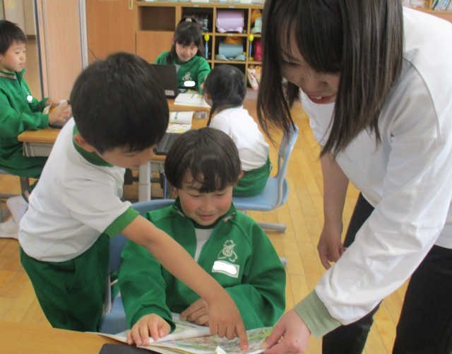 教科書の絵の中の人を探すクイズを考えます。どんな言葉を手がかりにすればいいかな?