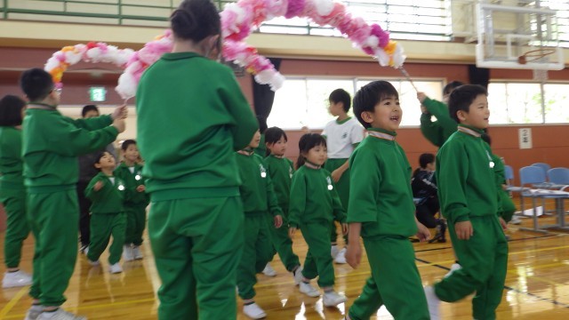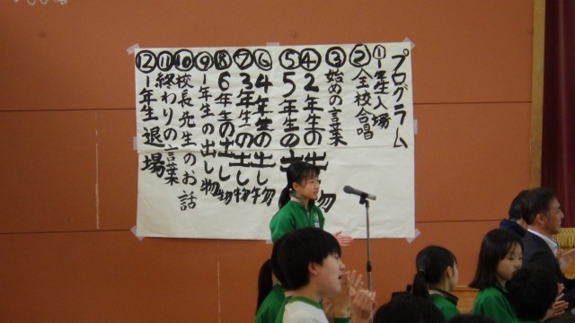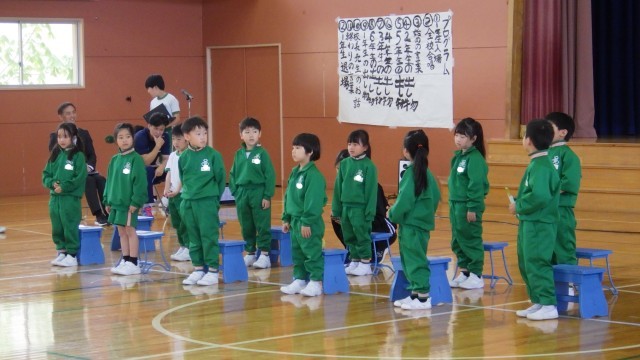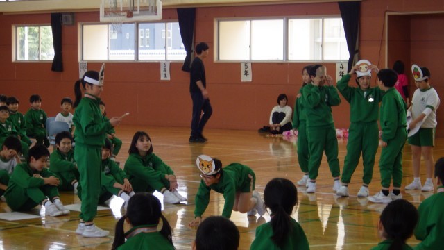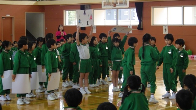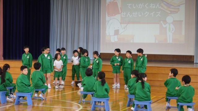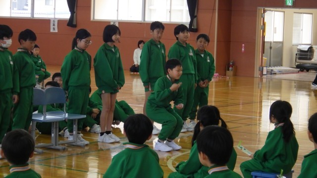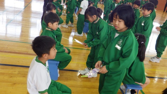 入学おめでとう集会を開きました。1年生が庄南っ子に仲間入りしたお祝いです。2年生からはプレゼント、3年生からは猛獣狩りゲーム、4年生からは先生クイズ、5年生からは学校クイズ、6年生からは学校行事の劇のプレゼントが贈られました。1年生はお返しに校歌を元気よく歌いました。心と心がつながり、温かな集会になりました。