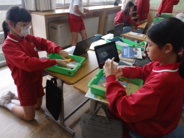 コップを重ねて回すと絵が変わる仕組みを使って、作品を作っています。絵をどのように変化させると楽しいかな?