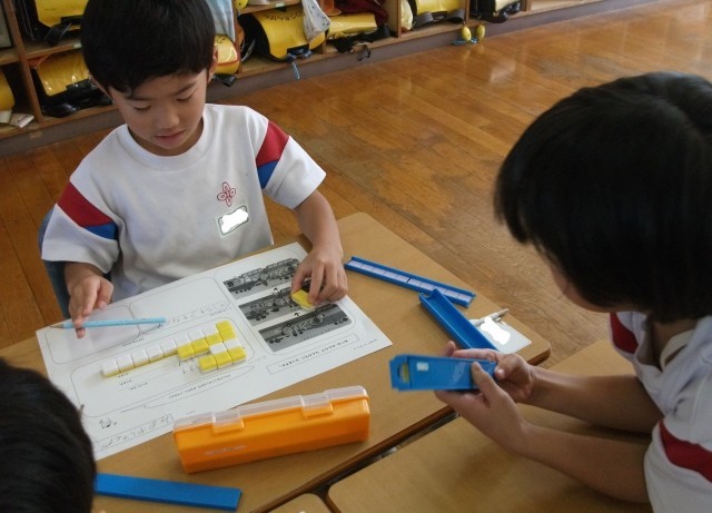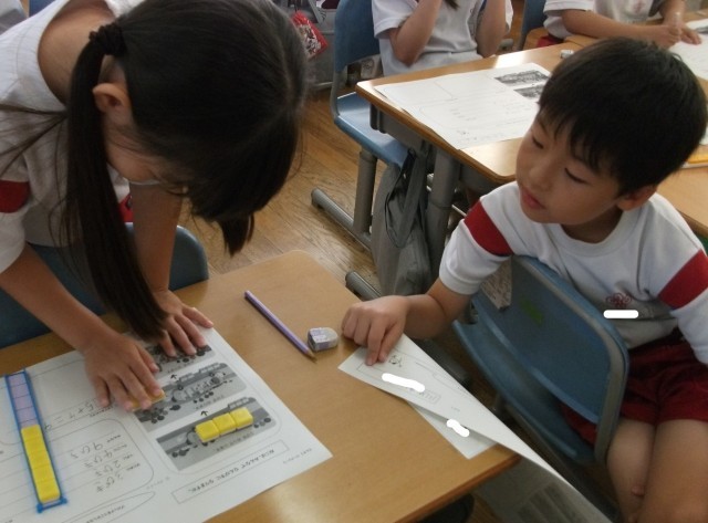 「のる・のる」お話 ー算数科ー (1年) 9月26日 公開日 2025/09/26 更新日 2025/09/26 1年生 バスに乗ったねこは、みんなで、なんびきになったでしょう?おはじきを使いながら、考えます。