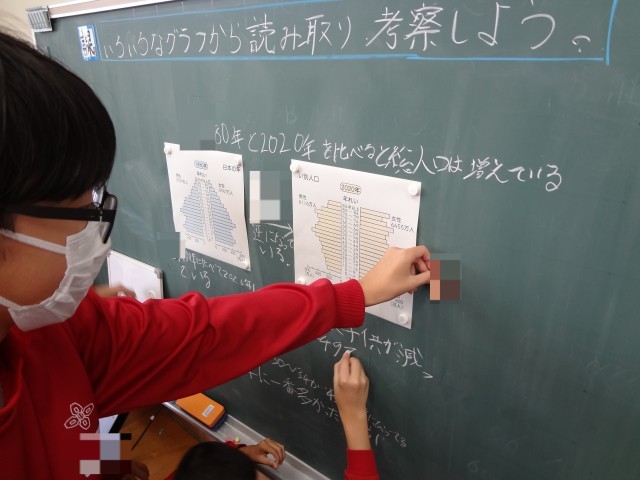 今日の学習では、日本の年齢別人口と、人口の変化と予測のグラフから、少子化・高齢化の現状についてまとめました。