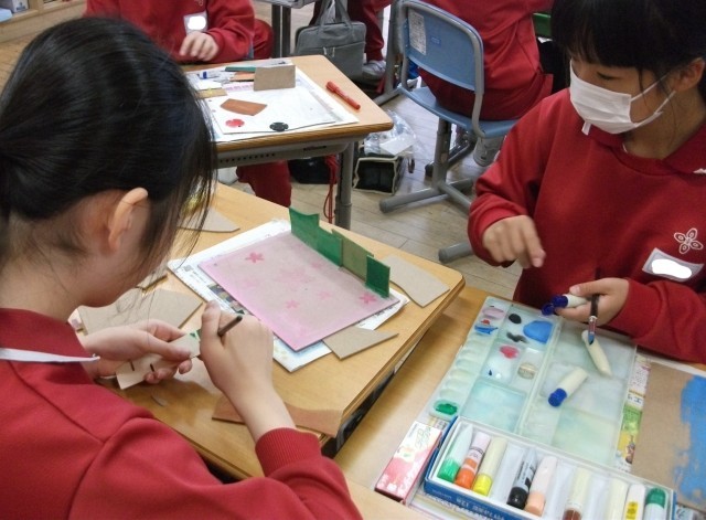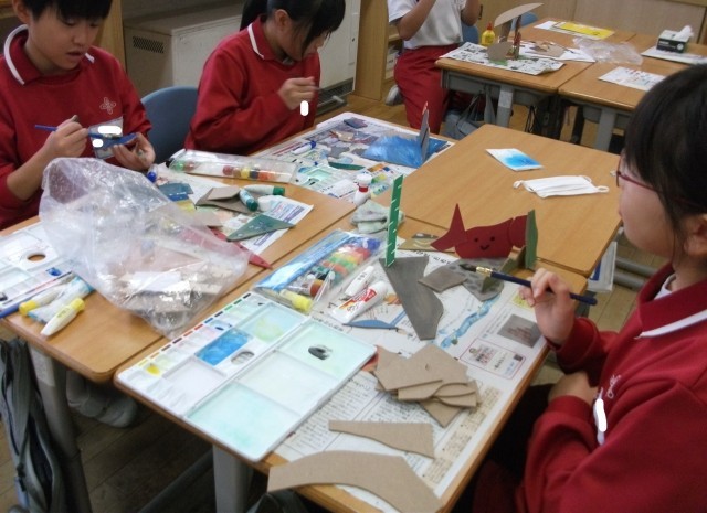 糸のこ探検隊 ー図画工作科ー (5年) 12月3日 公開日 2025/12/03 更新日 2025/12/03 5年生 電動糸のこぎりで切った形に色を塗っています。切り取った形を組み合わせて、作品に仕上げます。