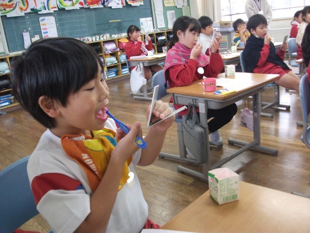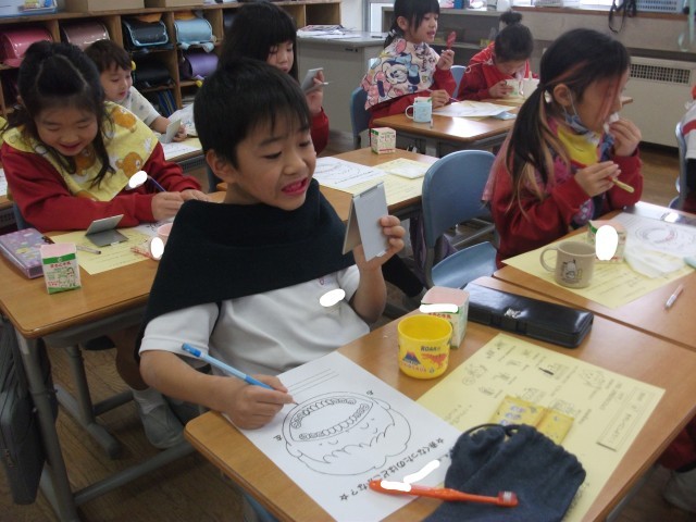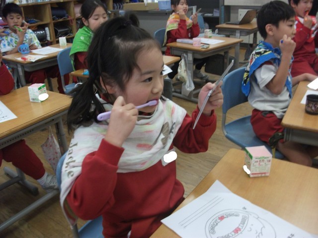 歯ブラシの使い方や歯の磨き方を教えていただきました。給食を食べた後には、学んだことを意識して歯を磨きました。