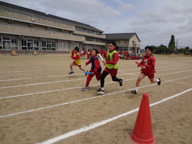 体育の学習でリレーを行っています。