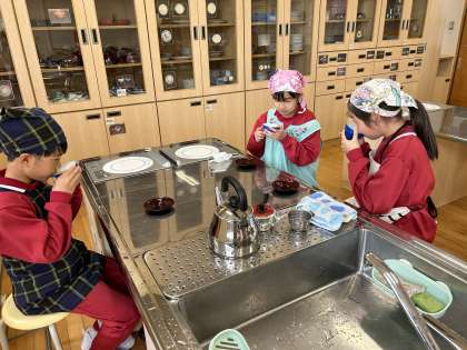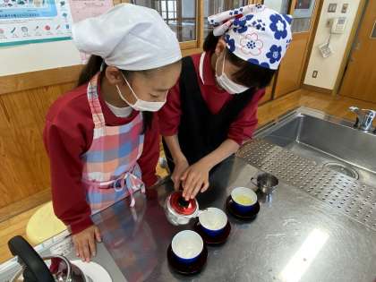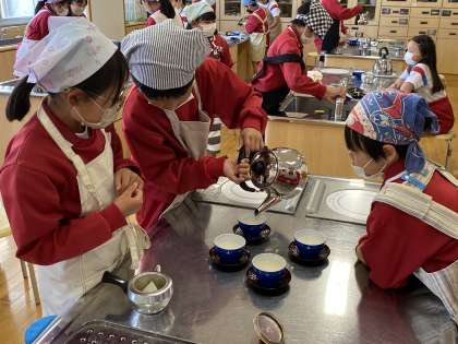 家庭科の授業では、初めての実習で湯を沸かしてお茶を飲みました。初めて湯を沸かした子どもも多く、楽しみながら行っていました。みんなで協力して取り組んでいました。