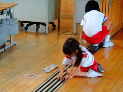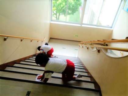 掃除の時間には、上級生と一緒に縦割り班で協力しながら、一生懸命掃除に取り組んでいます。