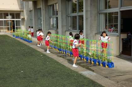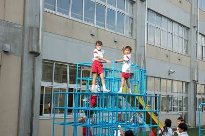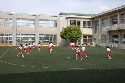 中庭では、たくさんの低学年の子供たちが遊んでいます。