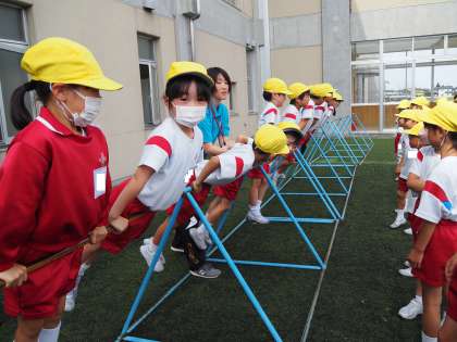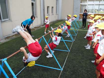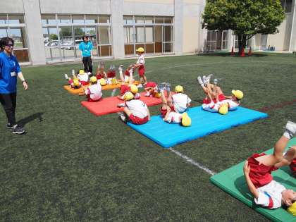 鉄棒での「つばめ」や足振り、マットでの「ゆりかご」や「後転」、
