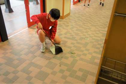 強風のため、玄関内に入ってきた落ち葉を片付ける6年生。