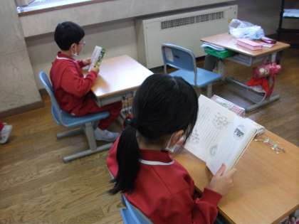 のびのびタイムには、思い思いの過ごし方をしている2年生の子供たち。学年フロアでは8の字とびの元気いっぱいのかけ声。教室では、落ち着いて読書。雨の晴れ間に中庭では、濡れた地面でドッジボールを楽しむ姿がありました。