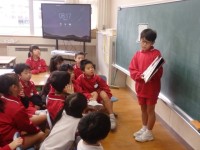 班長が、班員の様子を見て、振り返りながら登校してきました。