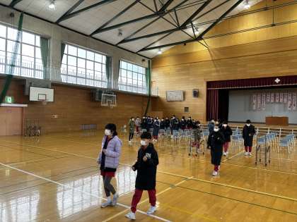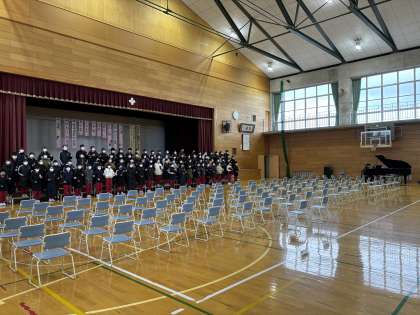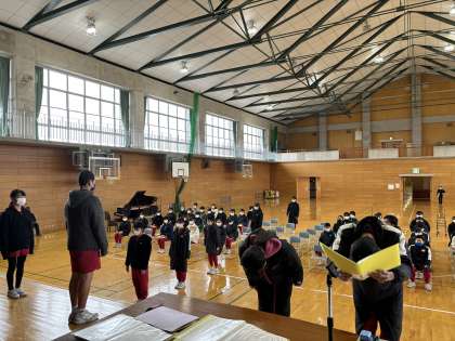 6年生は卒業式練習に取り組んでいます。入場や証書授与、交歓の詩等を一生懸命頑張っています。指先をまっすぐにすることやお辞儀の角度をみんなでそろえることなどを意識して練習しています。