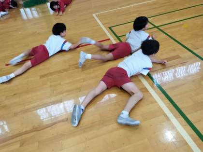 たくさんの忍者が?!(3年生)3月13日 公開日 2024/03/13 更新日 2024/03/13 3年生 3年生の体育科では、「忍者参上!」と題した表現運動に取り組んでいます。 今日は修行編で、忍者の動き、忍術を体いっぱい使って表現しました。