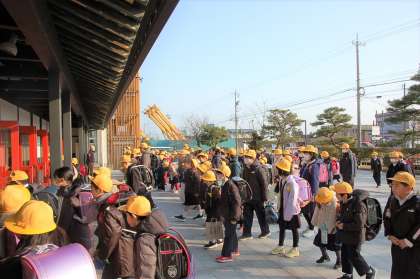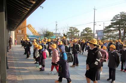 新登校班長のあいさつに続いて、新登校班であいさつをしています。